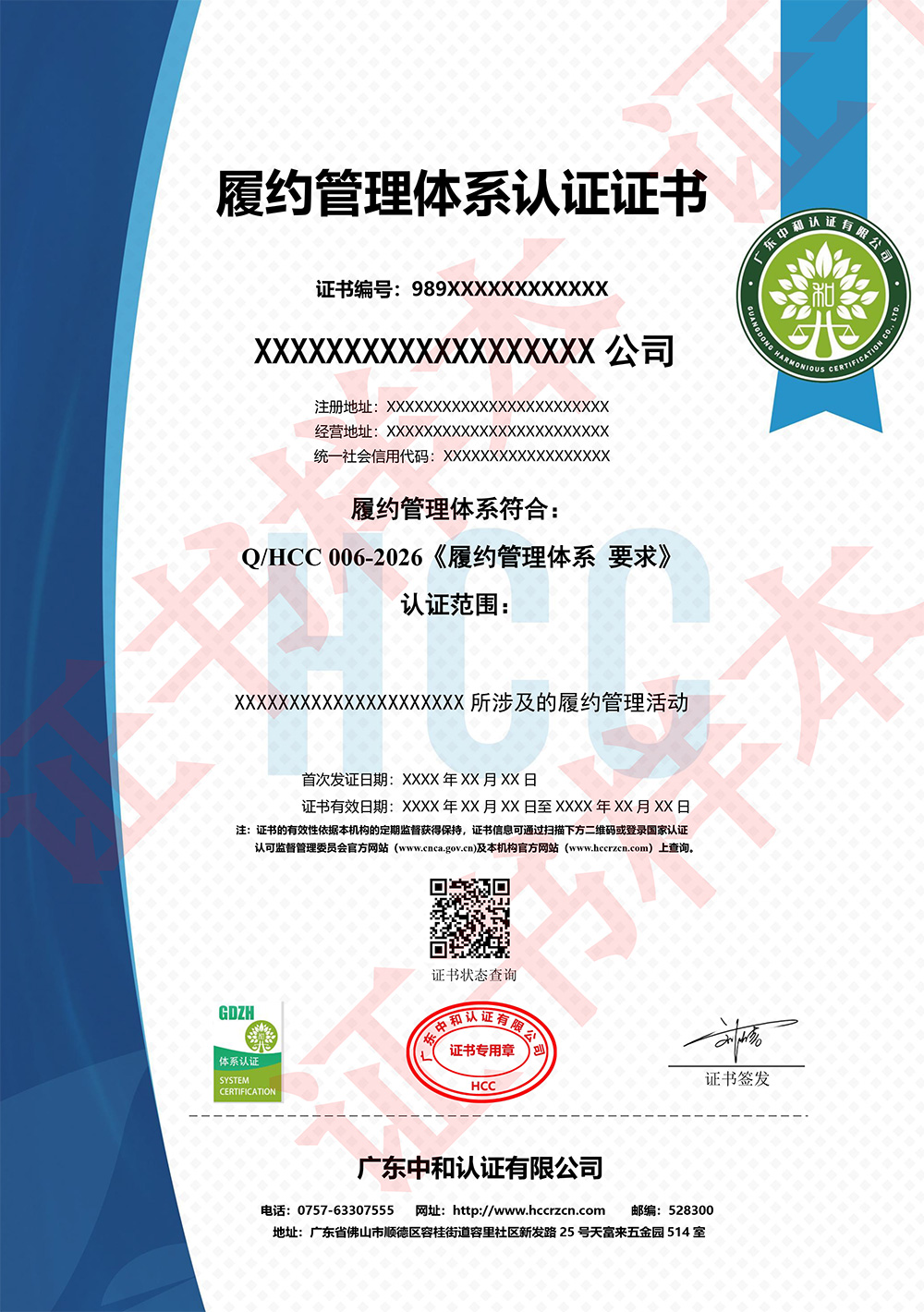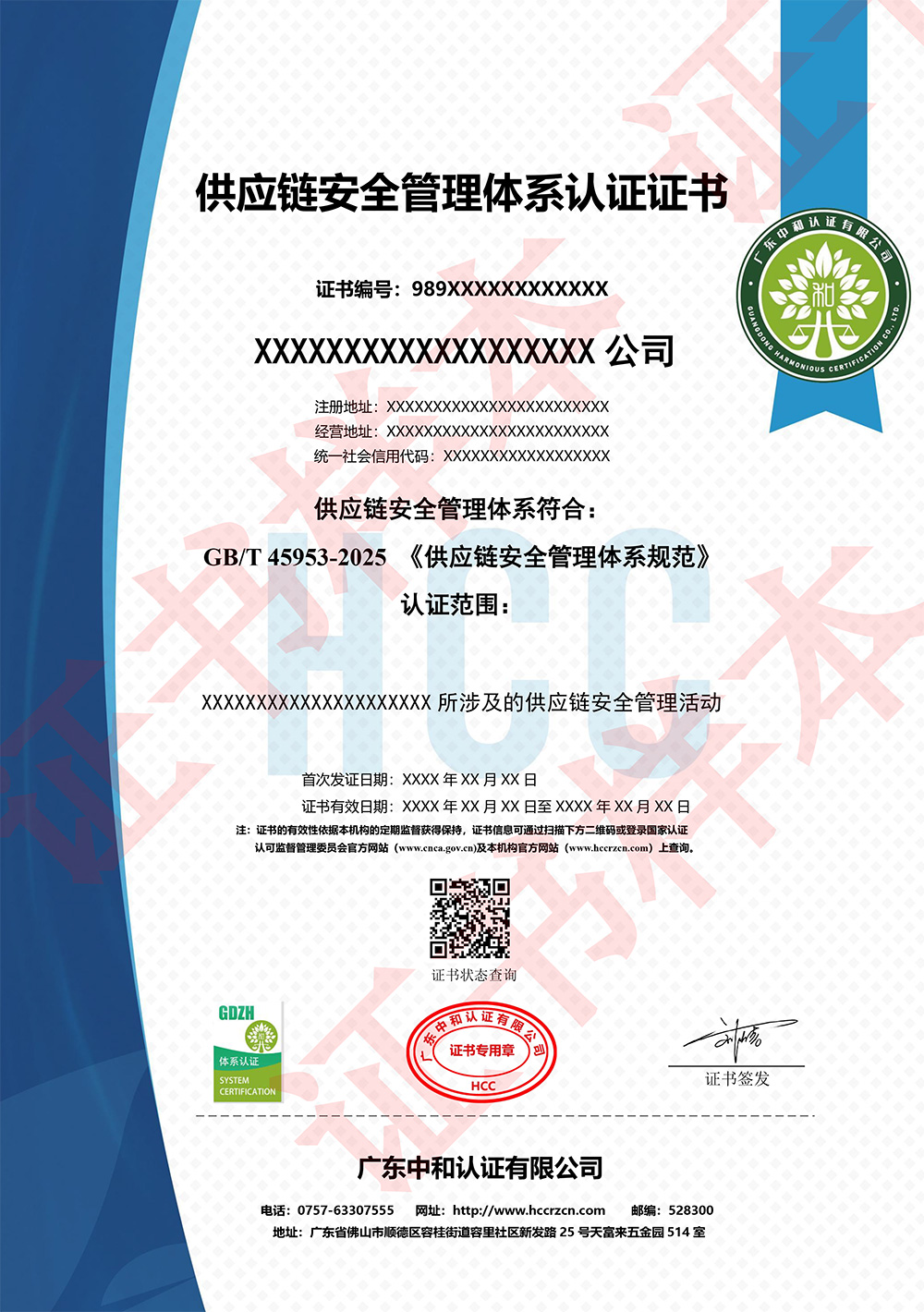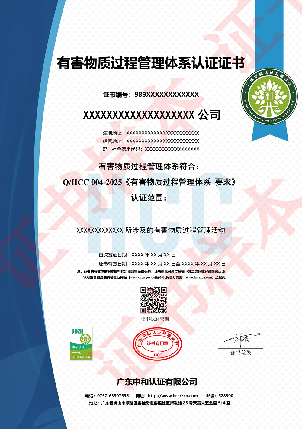 广东中和认证有限公司(简称中和认证,英文缩写HCC),是经中国国家认证监督管理委员会批准(批准号:CNCA-R-2022-989)的第三方认证机构,主要从事质量管理体系(ISO9001)、环境管理体系(ISO14001)、职业健康安全体系(ISO45001)等认证。通过打造标准、认证、审核三位一体的发展理念,为客户创造价值,为员工发展提供平台,为社会带来安全和信赖。